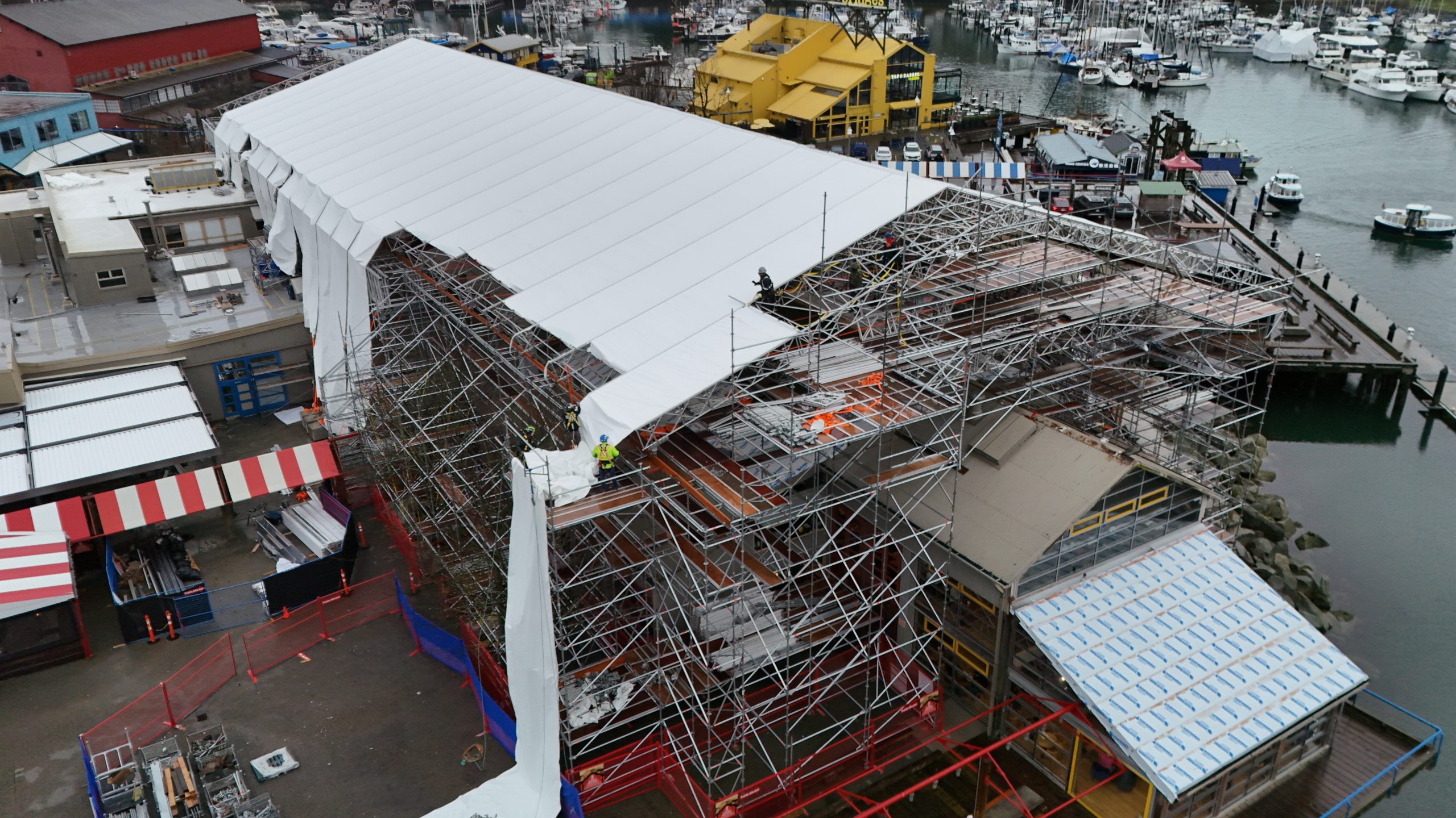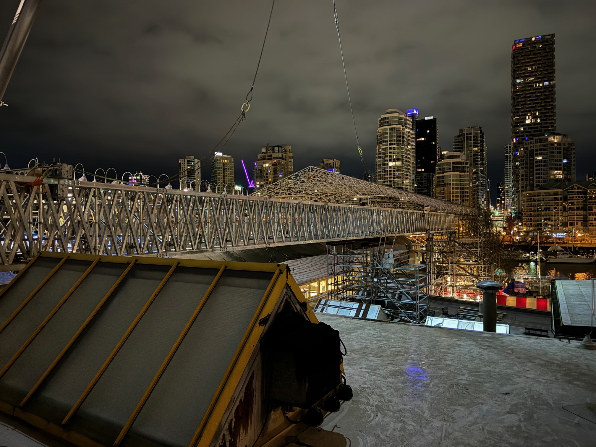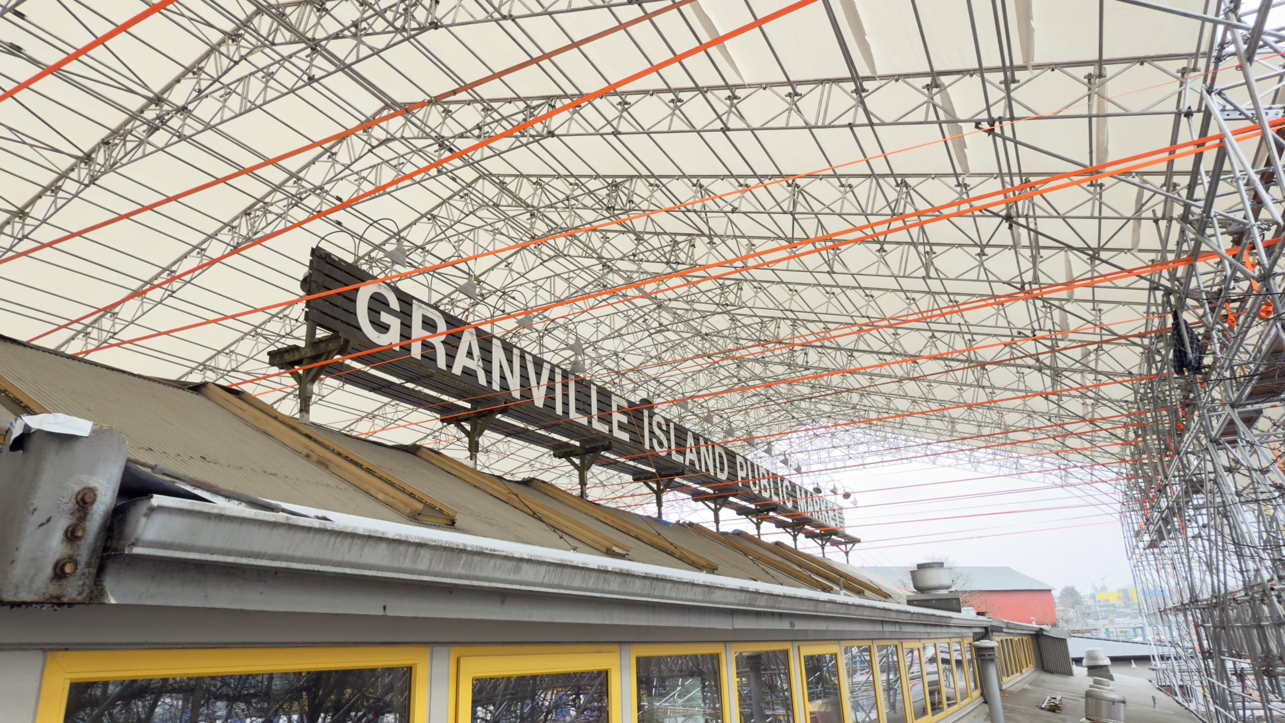 The Granville Island Public Market project featured the installation of a full temporary roof to protect ongoing works beneath one of Vancouver’s most iconic landmarks. Spanning 250 feet by 100 feet, the freestanding structure utilized North Scaffold Products’ (NSP) 750 mm Diamond Beam Roof System, delivering exceptional strength and stability across the entire covered area.