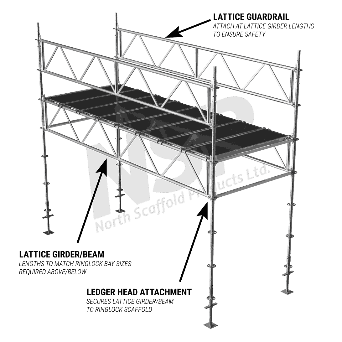 Lattice girders/beams are heavy duty horizontal braces that allow for larger spans or gaps over walkways, roads, ditches, etc. The Ledger heads (sometimes referred to as “Chicken Heads”) can be used to attach the Lattice Girder to the rosettes of the Standards . Clamps can be used as an alternative