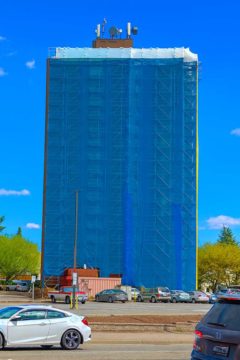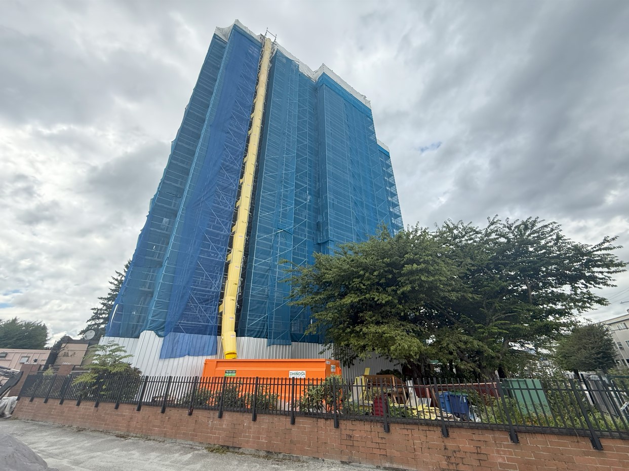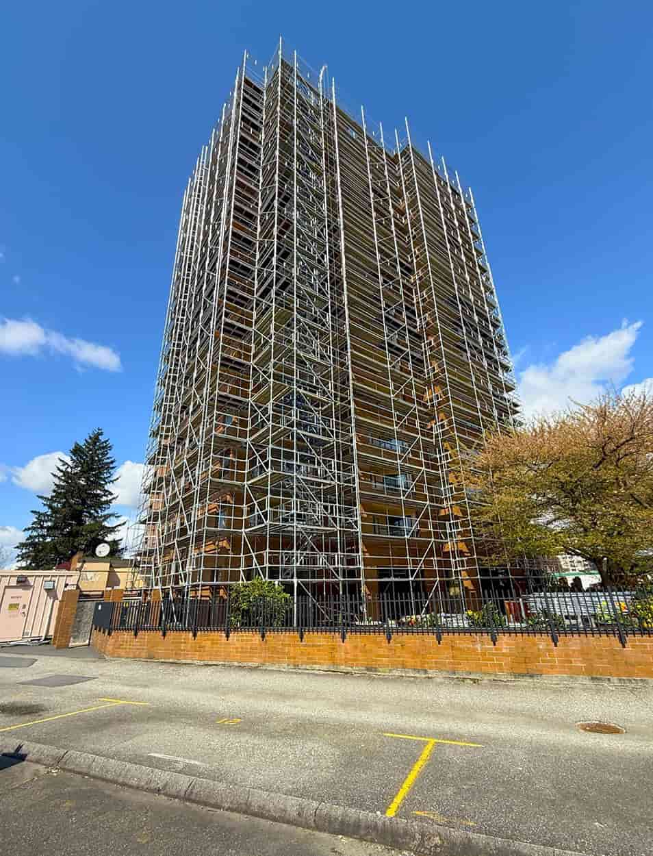 Residential high-rise in Maple Ridge, BC scaffolded with North Scaffold Products’ Ringlock system, including stair towers, debris mesh, and garbage chutes to provide enclosed, safe exterior access for renovation work.