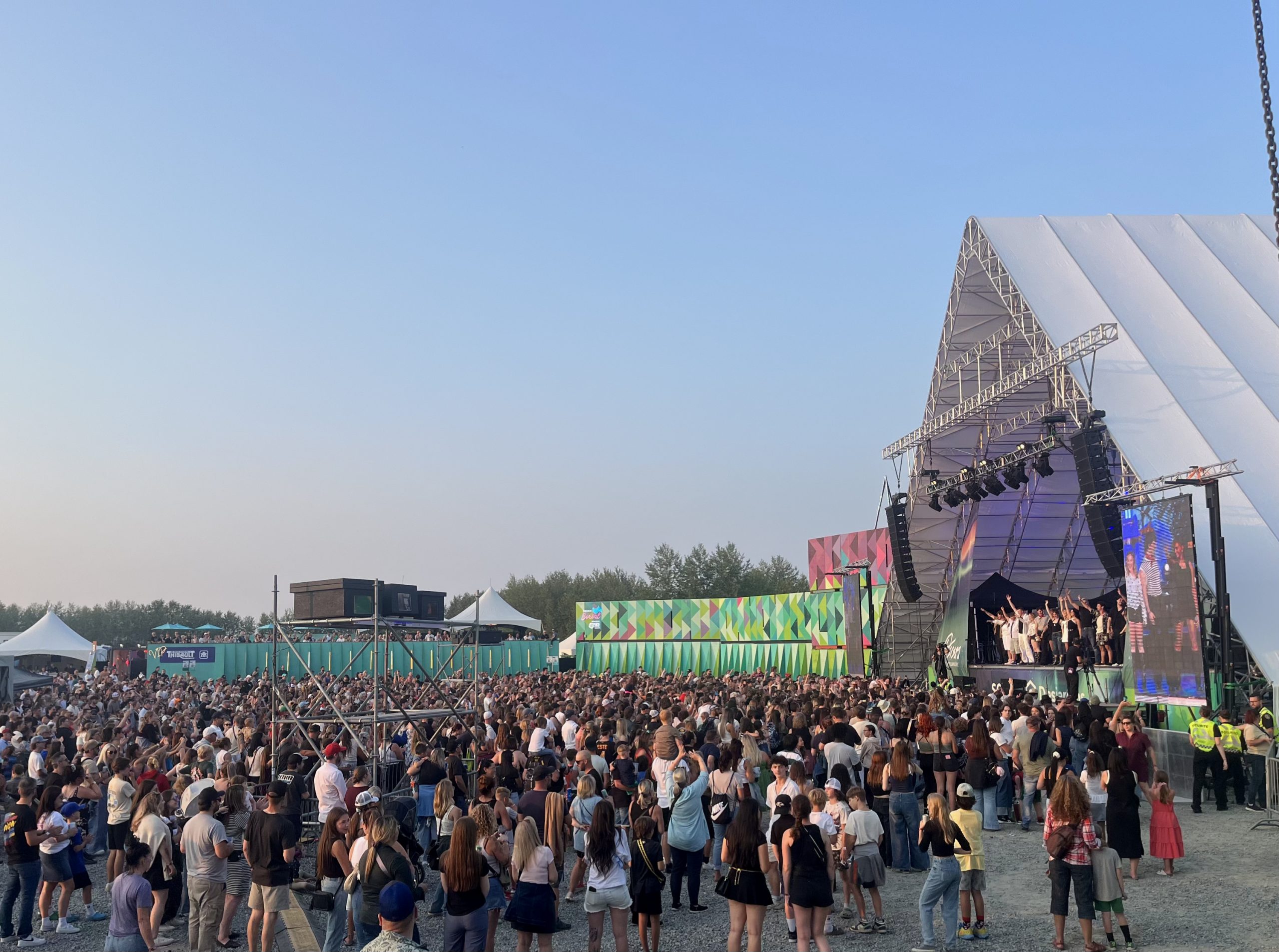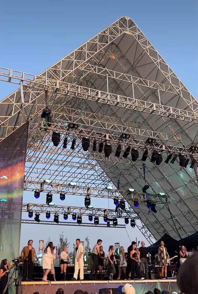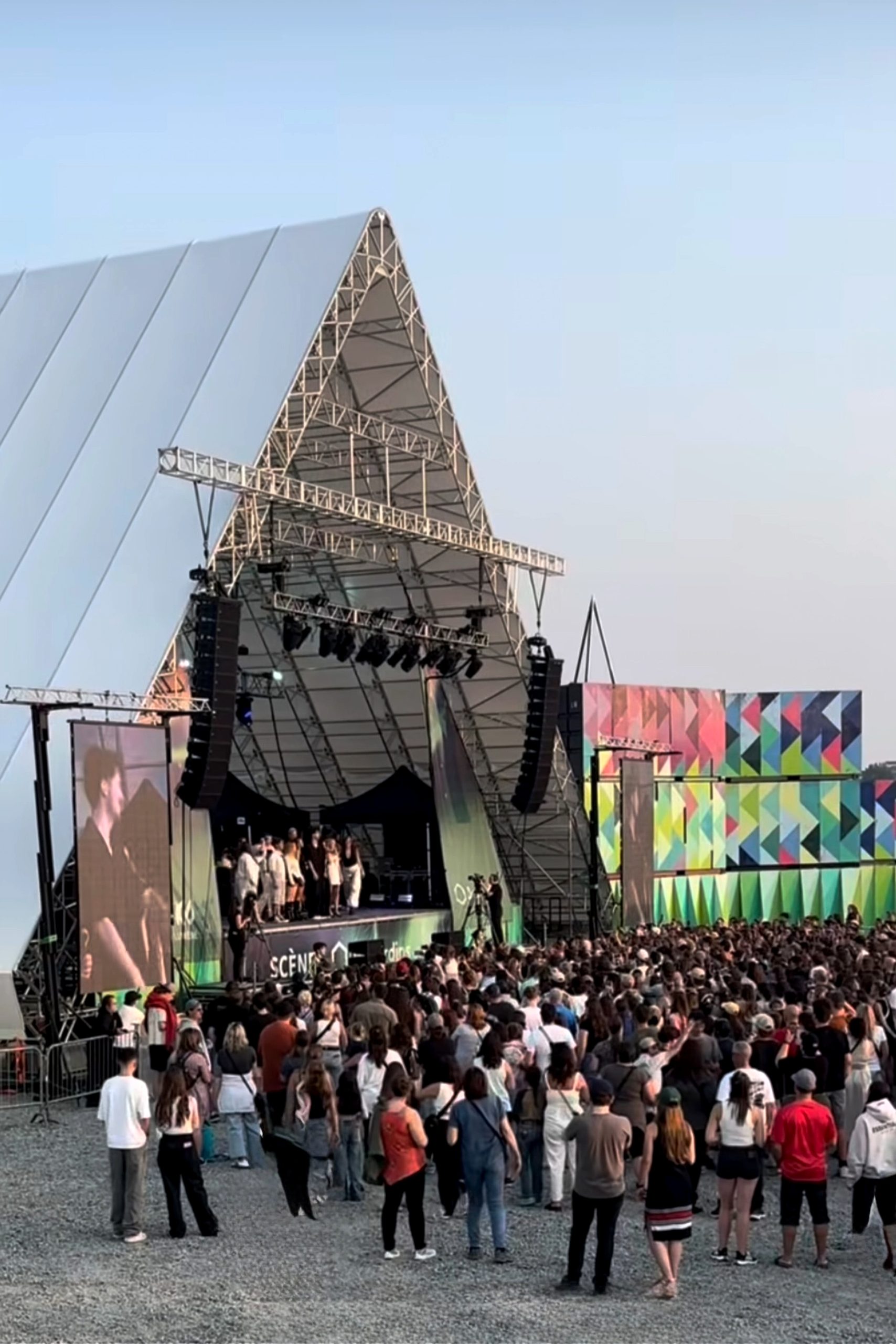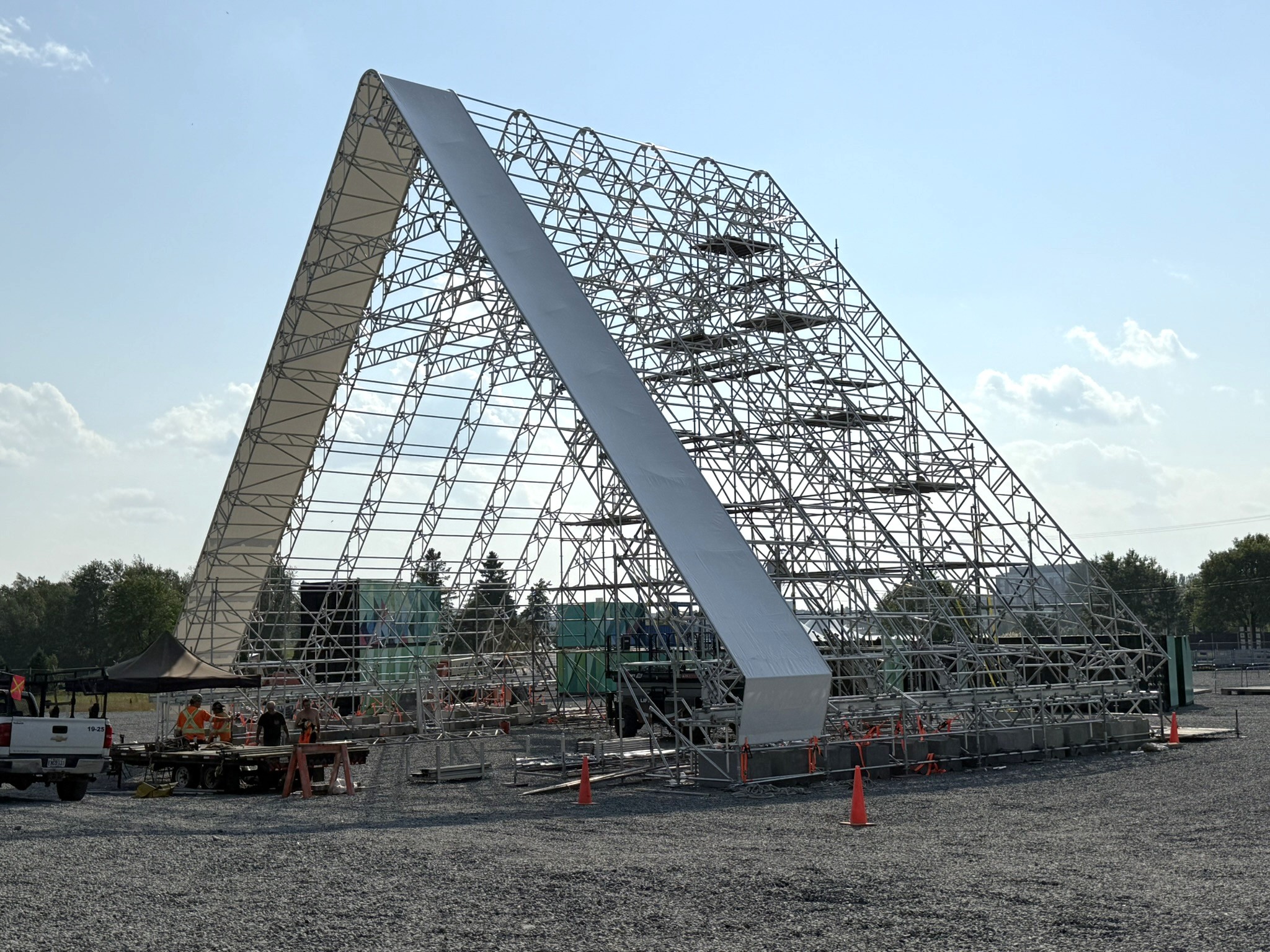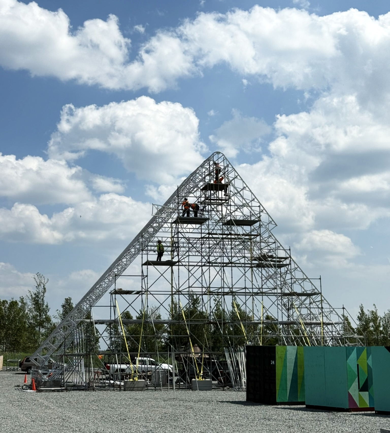 North Scaffold Products was proud to partner with the team at Osisko en Lumière to design and deliver a custom A-frame style stage cover using our Diamond Beam Keder Roof System. Engineered to meet both functional and aesthetic goals, the structure provided full stage protection while serving as a robust framework for suspending lighting and sound equipment. The bold profile of the A-frame design added a striking visual element, enhancing the overall event experience.