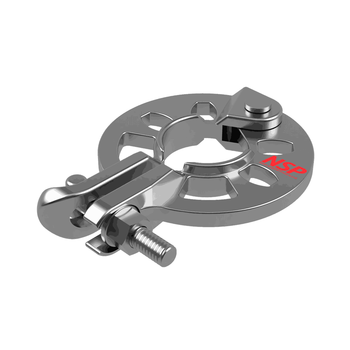 The Adjustable Rosette is used as a clamp to add a rosette at any point on a vertical Ringlock Standard or Aluminum Tube. This allows for the installation of horizontal members, such as the Ledger, to be used at any point along the vertical member. The Bay Brace can also be attached to the diagonal holes found on the rosettes.