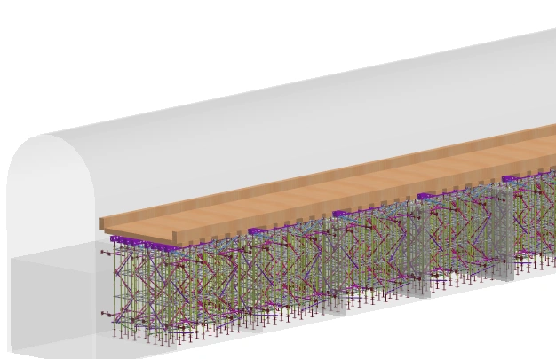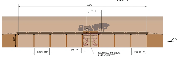 The Rocktrap Scaffold Bridge project presented significant challenges, requiring careful planning and execution to ensure the safety of the Utimec LF 600 Transmixer. With a maximum capacity of 28,500 kg (62,831.7 lbs) and four points of contact, the load was evenly distributed using industrial-grade Soldier Beams to prevent localized failures. Advanced 3D design analysis with SolidWorks software allowed precise component placement without obstructing truck movement. Custom parts were designed to handle the unique load requirements, seamlessly integrating with the scaffold system and reinforcing critical points for structural stability. Coordinated design and manufacturing processes ensured a successful assembly meeting project specifications.
